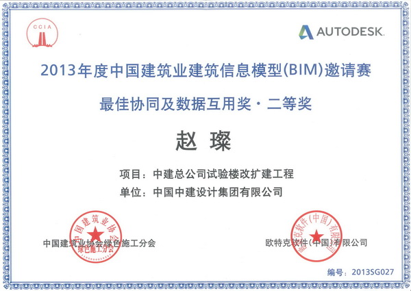 2013年11月5日,由中国建筑业协会和欧特克(中国)有限公司联合举办,“2013年度中国建筑业建筑信息模型(BIM)邀请赛”颁奖仪式在北京举行,来自全国范围93个单位的226个作品参加比赛。
