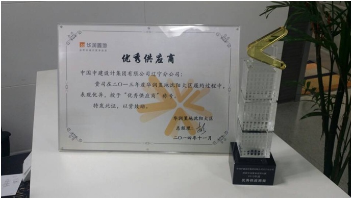 中国中建设计集团有限公司辽宁分公司在二〇一三年度华润置地沈阳大区履约过程中,表现优异,华润置地授予我司“优秀供应商”称号。
