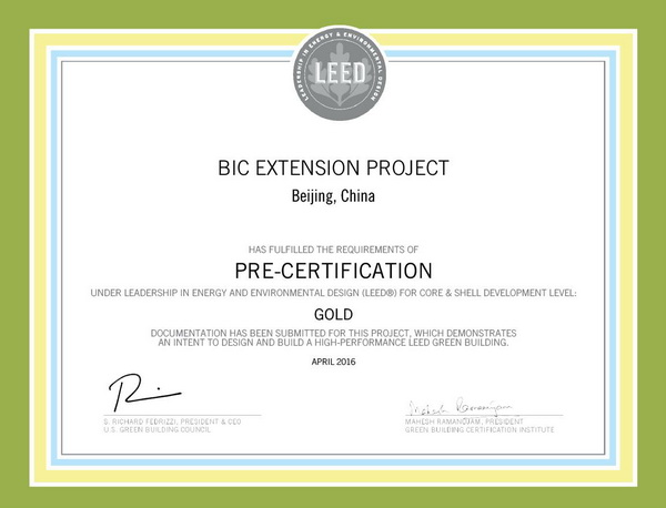 由我院建筑环境与节能工作室咨询服务的“北京国际俱乐部改扩建工程”获得了美国绿色建筑委员会颁发的LEED-CS金级预认证证书。